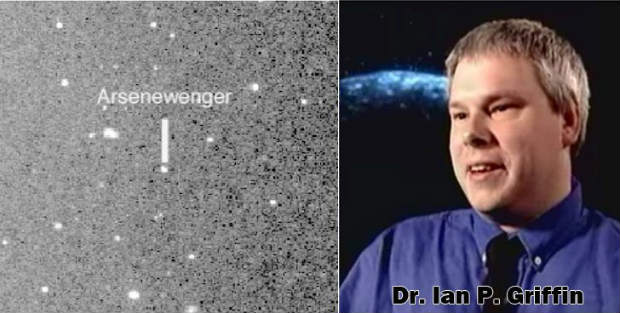 Ian-P-Griffin-Arsenewenger-asteroidIan P. Griffin discovered a main belt asteroid on March  29, 1998. He being a fan of Arsenal Football club named the asteroid as 33179 Arsènewenger.
